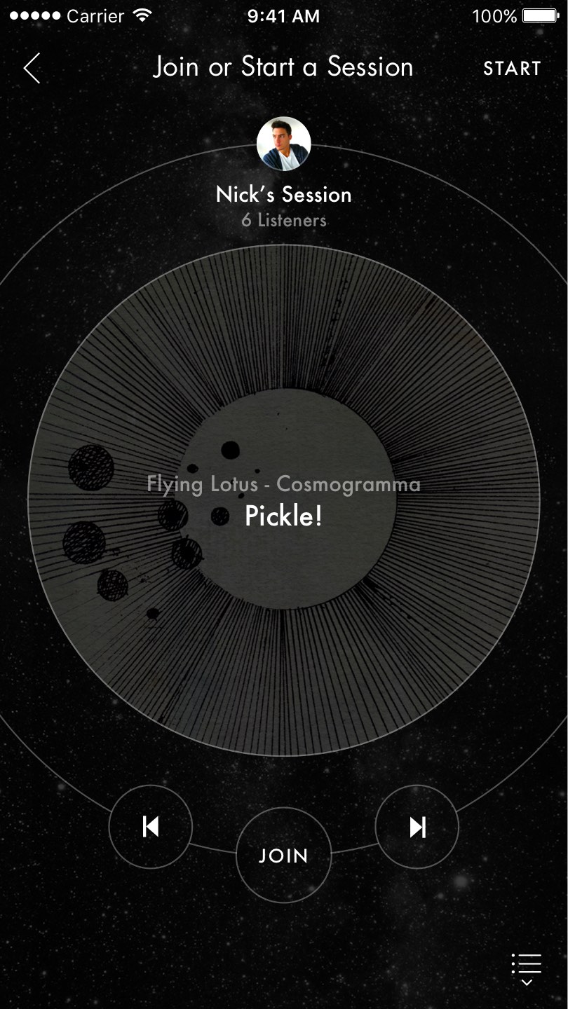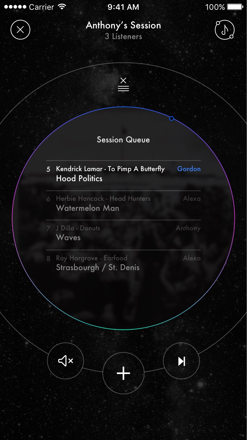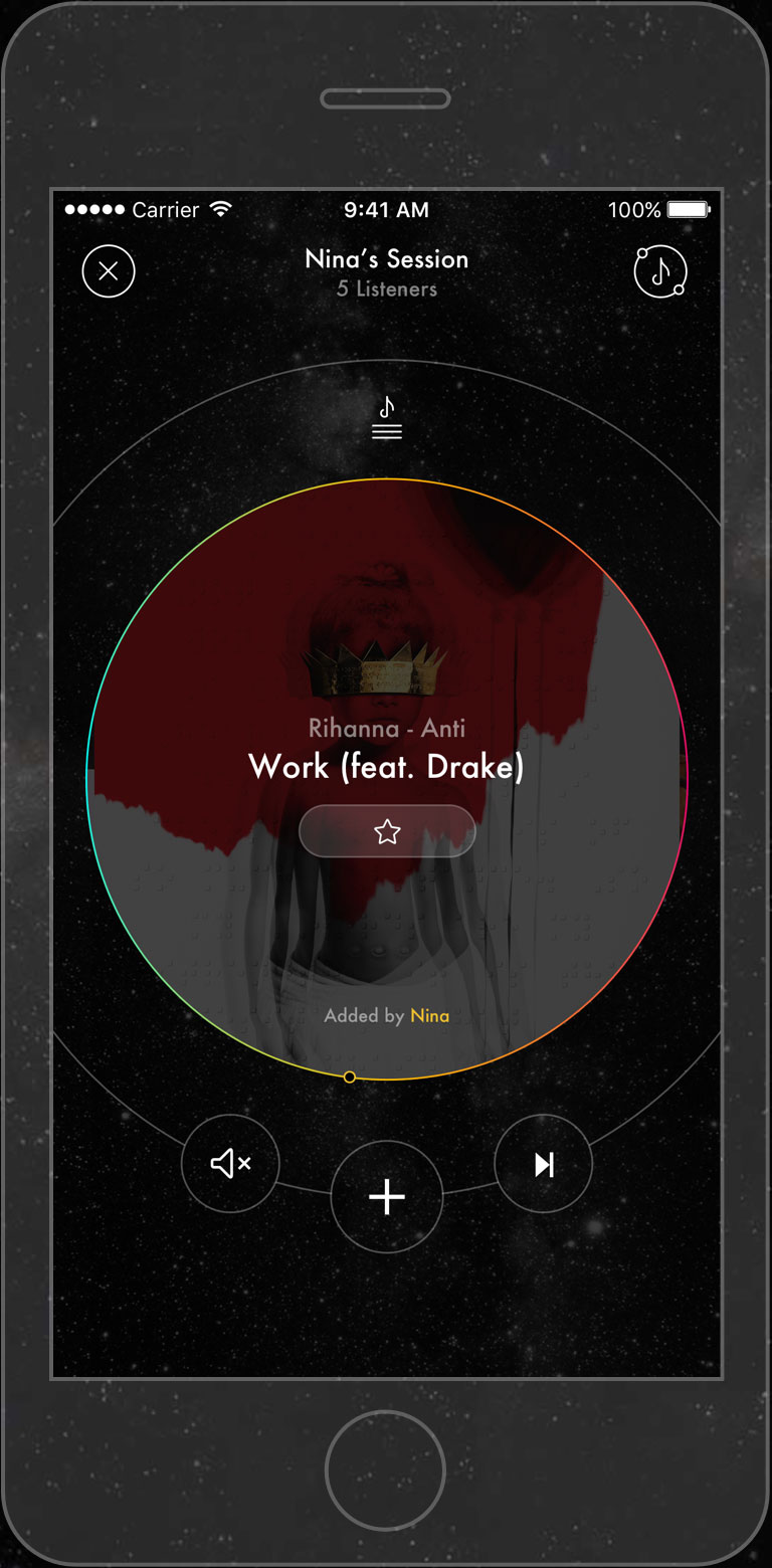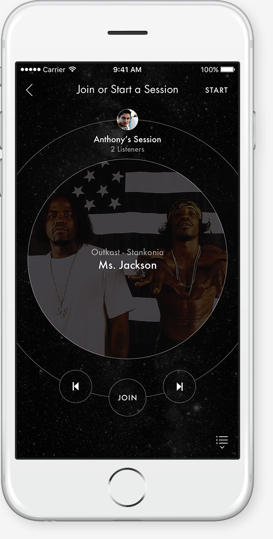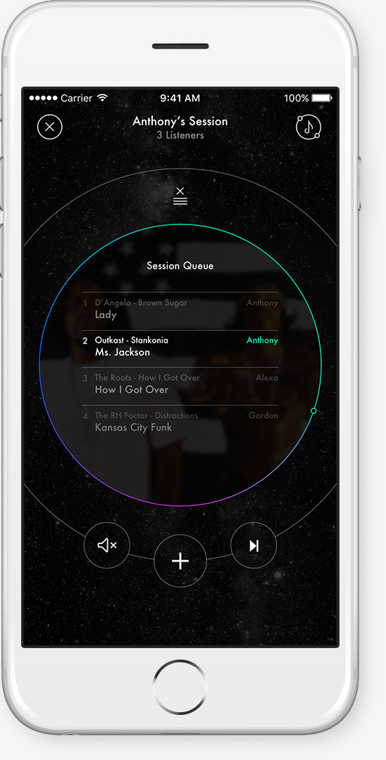 Neptune replicates the physical interaction of sharing and listening to music with friends in the same room. A Neptune user can either listen to music alone or invite friends to a listening session, in which songs can be collectively added to a queue and listened to simultaneously.